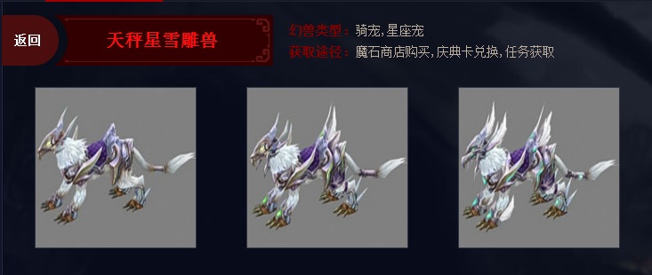 欢迎来到本期的魔域万兽谱,本期给大家带来的三只幻兽分别是:天秤星雪雕兽、粉晶法师维维亚、星彩精灵·希梦,一只坐骑、一只媒体宠、以及一只骑士。